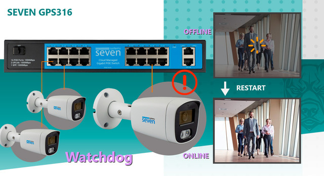 Функція Watchdog забезпечує автоматичний контроль працездатності під'єднаних пристроїв, наприклад IP-камер. Якщо камера перестає відповідати або "зависає", комутатор автоматично аналізує, що відбувається з під'єднаним пристроєм і перезапускає живлення на відповідному порту, відновлюючи роботу камери без втручання користувача.