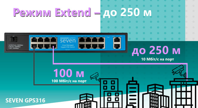 - Потрібно під'єднати камеру на великій відстані від комутатора? З комутаторами SEVEN ви можете активувати режим подовження лінії на ОДНОМ обраному порту, а не на всіх відразу. Це дає змогу передавати дані та живлення набагато більшу відстань — до 250 метрів — без впливу на інші порти, що працюють на стандартній швидкості.