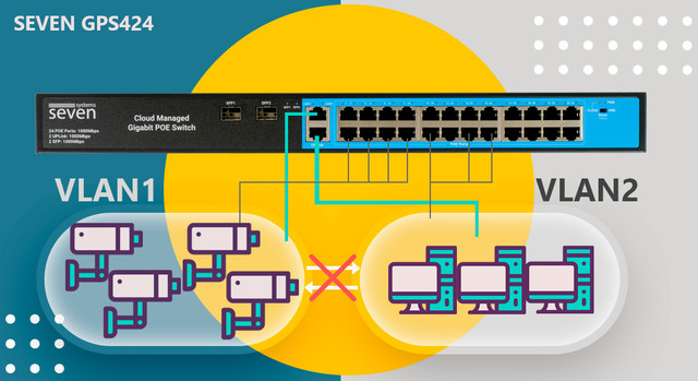 Функція VLAN в комутаторі SEVEN GPS424 дає змогу логічно розділити його порти, ізолюючи пристрої один від одного. Такий поділ дає змогу розмежувати загальний трафік усередині мережі, запобігати можливим конфліктам і перевантаження каналів передавання даних, підвищувати стабільність і безпеку роботи системи, а також ускладнювати несанкціонований доступ між приєднаними пристроями.