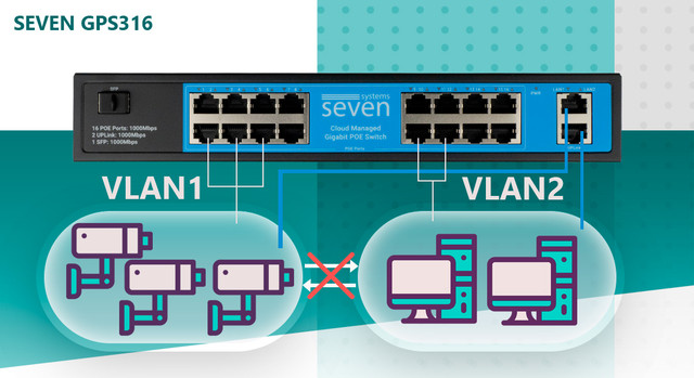 Функция VLAN в коммутаторе SEVEN GPS316 позволяет логически разделить его порты, изолируя устройства друг от друга. Такое разделение позволяет разграничивать общий трафик внутри сети, предотвращать возможные конфликты и перегрузку каналов передачи данных, повышать стабильность и безопасность работы системы, а также затруднять несанкционированный доступ между подключёнными устройствами.
