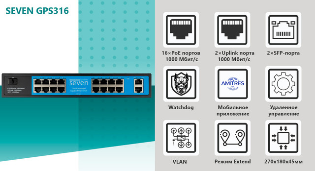 Управляемый коммутатор предоставляет возможность тонкой настройки PoE-портов и конфигурации сети. Модель SEVEN GPS316 выступает не просто как стандартное сетевое оборудование, а как продвинутое решение, повышающее гибкость, экономическую эффективность и конкурентоспособность сервисного бизнеса. Устройство обеспечивает обслуживание большего количества объектов одновременно, при этом сохраняется высокий уровень качества предоставляемых услуг. Среди ключевых функций стоит отметить технологию PoE Watchdog, которая автоматически перезапускает неактивные устройства для поддержания стабильной работы системы. Режим extend позволяет передавать данные на расстояние до 250 метров на скорости 10 Мбит/с, что делает его подходящим решением для организации видеонаблюдения на крупных площадках. Управление коммутатором доступно через мобильное приложение с обширным набором инструментов настройки, что значительно упрощает эксплуатацию устройства.