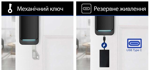 В случае разрядки батарей замок имеет резервные способы открытия: механический ключ или разъем Typе-C для временного питания от повербанка.