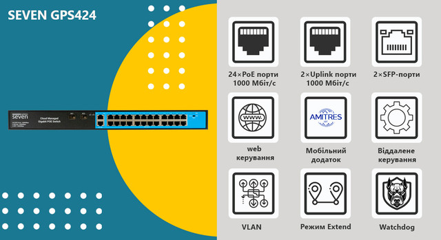Керований комутатор надає можливість тонкого настроювання PoE-портів і конфігурації мережі. Модель SEVEN GPS424 слугує не просто як стандартне мережеве обладнання, а як просунуте рішення, що підвищує гнучкість, економну ефективність і конкурентоспроможність сервісного бізнесу. Пристрій забезпечує обслуговування більшої кількості об'єктів одночасно, водночас зберігається високий рівень якості наданих послуг. Серед ключових функцій варто зазначити технологію PoE Watchdog, яка автоматично перезапускає неактивні пристрої для підтримки стабільної роботи системи. Режим extend дає змогу передавати дані на відстань до 250 метрів на швидкості 10 Мбіт/с, що робить його підходящим рішенням для організації відеоспостереження на великих майданчиках. Керування комутатором доступне через мобільний застосунок із великим набором інструментів настроювання, що неабияк спрощує експлуатацію пристрою.