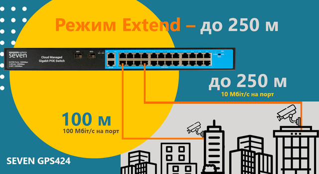 - Потрібно під'єднати камеру на великій відстані від комутатора? З комутаторами SEVEN ви можете активувати режим подовження лінії на ОДНОМ обраному порту, а не на всіх відразу. Це дає змогу передавати дані та живлення набагато більшу відстань — до 250 метрів — без впливу на інші порти, що працюють на стандартній швидкості.