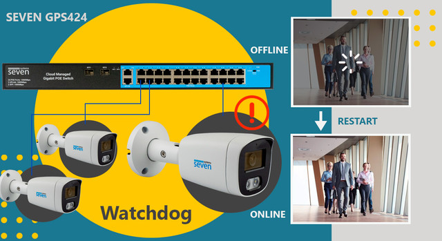 Функция Watchdog обеспечивает автоматический контроль работоспособности подключённых устройств, например IP-камер. Если камера перестаёт отвечать или "зависает", коммутатор автоматически анализирует что происходит с подключенным устройством и перезапускает питание на соответствующем порту, восстанавливая работу камеры без вмешательства пользователя.