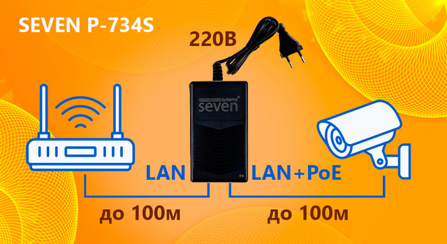 Электрическая энергия и данные передаются по одному Ethernet-кабелю к сетевым устройствам, таким как IP-камеры, точки доступа Wi-Fi и другие. Устройство одновременно передаёт данные и обеспечивает питание постоянным током. При использовании PoE-инжектора SEVEN P-734S не нужно прокладывать отдельный силовой кабель для питания устройства.