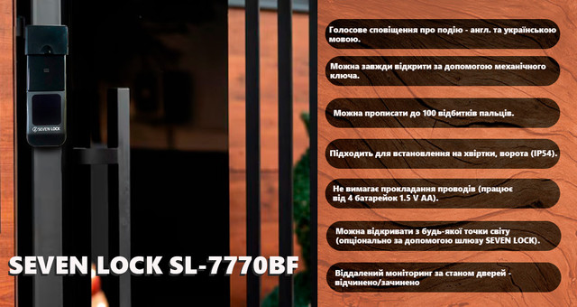 Умный электромоторный замок SEVEN SL-7770BF — это современная альтернатива традиционным электромеханическим замкам. Смарт-замок сочетает надёжную защиту и комфорт в повседневном использовании. Данная модель хорошо подходит для установки на калитках, воротах, тамбурных и офисных металлических и деревянных дверях. Благодаря электромоторному принципу работы замок функционирует значительно тише, чем обычные электромеханические — вместо резкого щелчка слышен лишь мягкий звук работы мотора.
